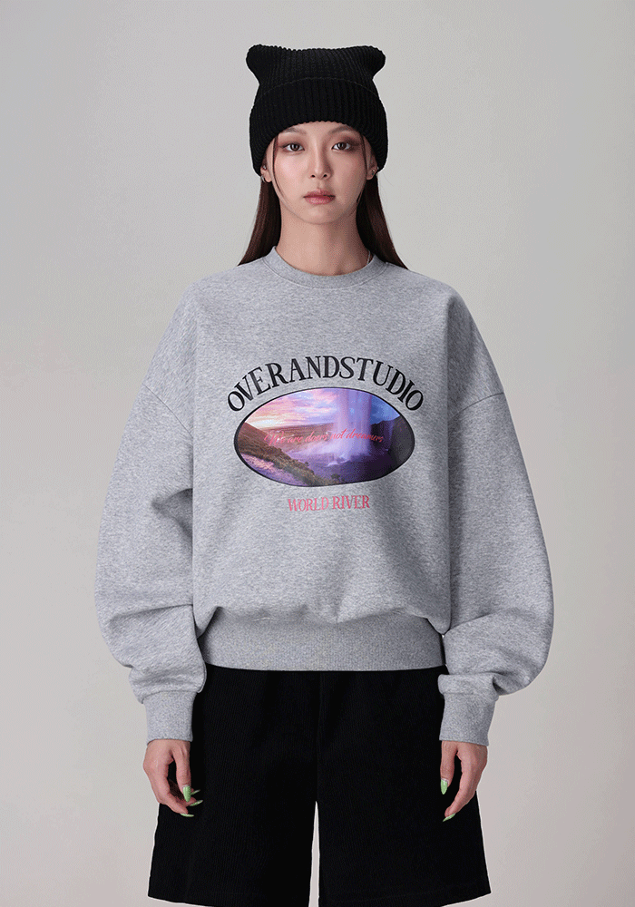 - 오버앤 자체제작 메이드 기모 맨투맨입니다. - 깔끔한 라운드 네크라인입니다. - 따뜻한 기모안감으로 보온성을 높여주었습니다. - 오로라 리버 나염 프린팅으로포인트를 주었습니다.