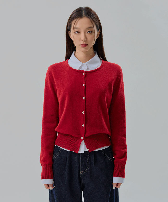 - 고퀄리티 울 혼방 니트 패브릭 - 백 넥라인 아래 리본 자수 포인트 - 골드볼이 반짝히는 세련된 단추 - 여리여리해보이는 얇은 넥라인 - 깔끔한 스탠다드핏 실루엣 연출